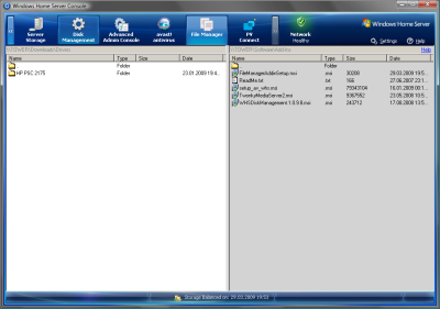 The add-in WHS File Manager is a simple dual-pane file manager for the Windows Home Server management concole which allows you to safely copy, move and delete files on your home server.