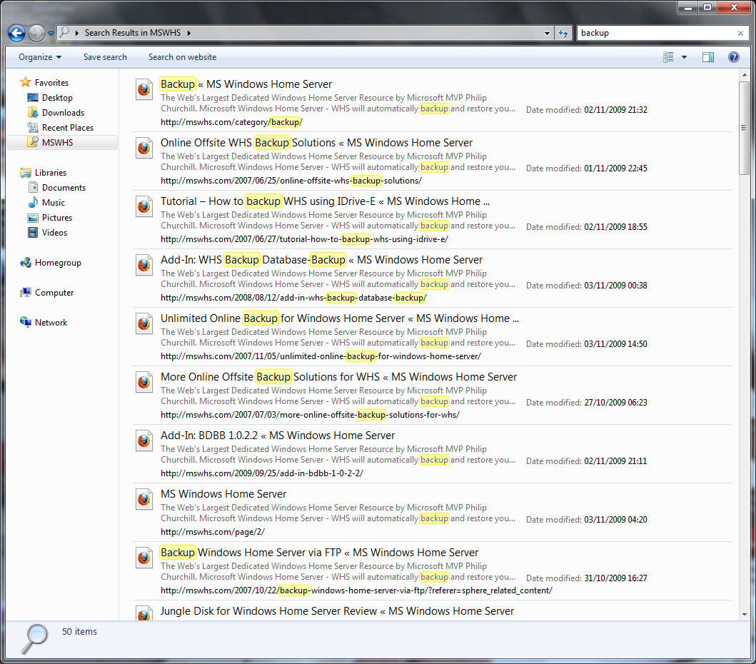 For example you can search a web site (like mswhs.com) directly from the Windows 7 search box, and to make that possible we have made a search connector for MSWHS.com which also adds MSWHS to your favorite locations in Win7.